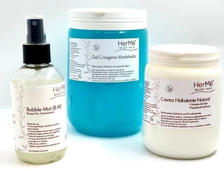 El set contiene 3 productos, Bubble Mist x 200ml con vaporizador ... Bruma Pretratamiento; Gel Criogeno Reductor Modelador x 1 kilo y una Crema Hidratante Corporal de Germen de Trigo & Pepitas de Damasco x 500gr.